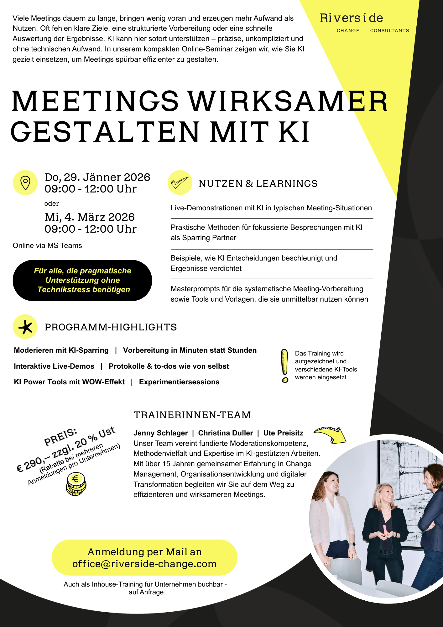 Meetings sind oft entscheidend für Zusammenarbeit und Abstimmung — aber gleichzeitig Zeitfresser: zu unstrukturiert, zu lang, mit zu wenig greifbarem Ergebnis. Besonders in Phasen hoher Dynamik oder Veränderung hemmen sie Entscheidungen und Umsetzung.